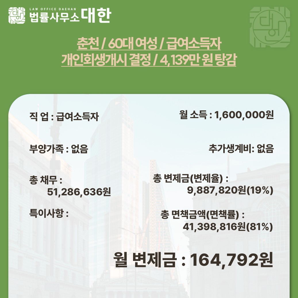 춘천 / 60대 여성 / 급여소득자 / 개인회생 개시결정 / 4,139만 원 탕감