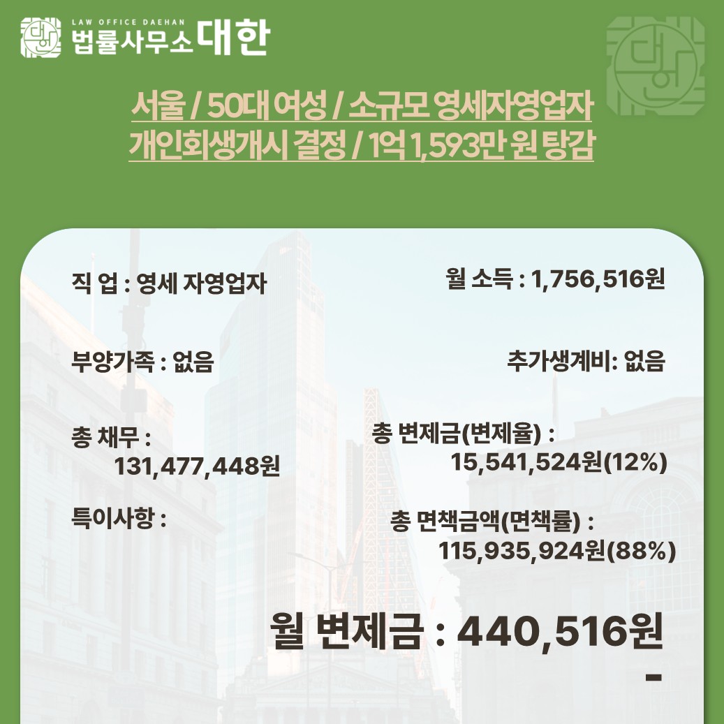 서울 / 50대 여성 / 소규모 영세자영업자 / 개인회생개시결정 / 1억 1,593만 원 탕감