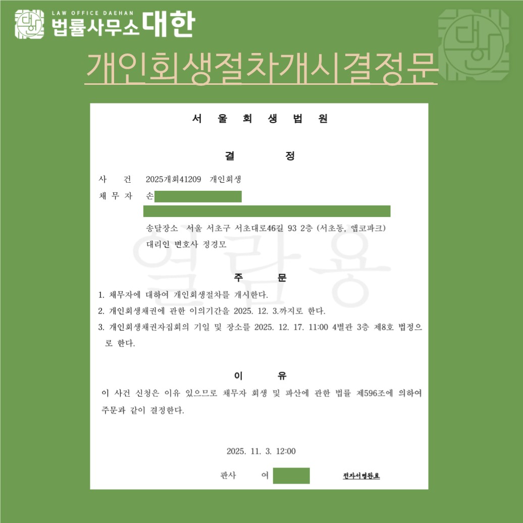 서울/60대 남성/법인대표/개인회생개시결정/2억 1천만 원 탕감