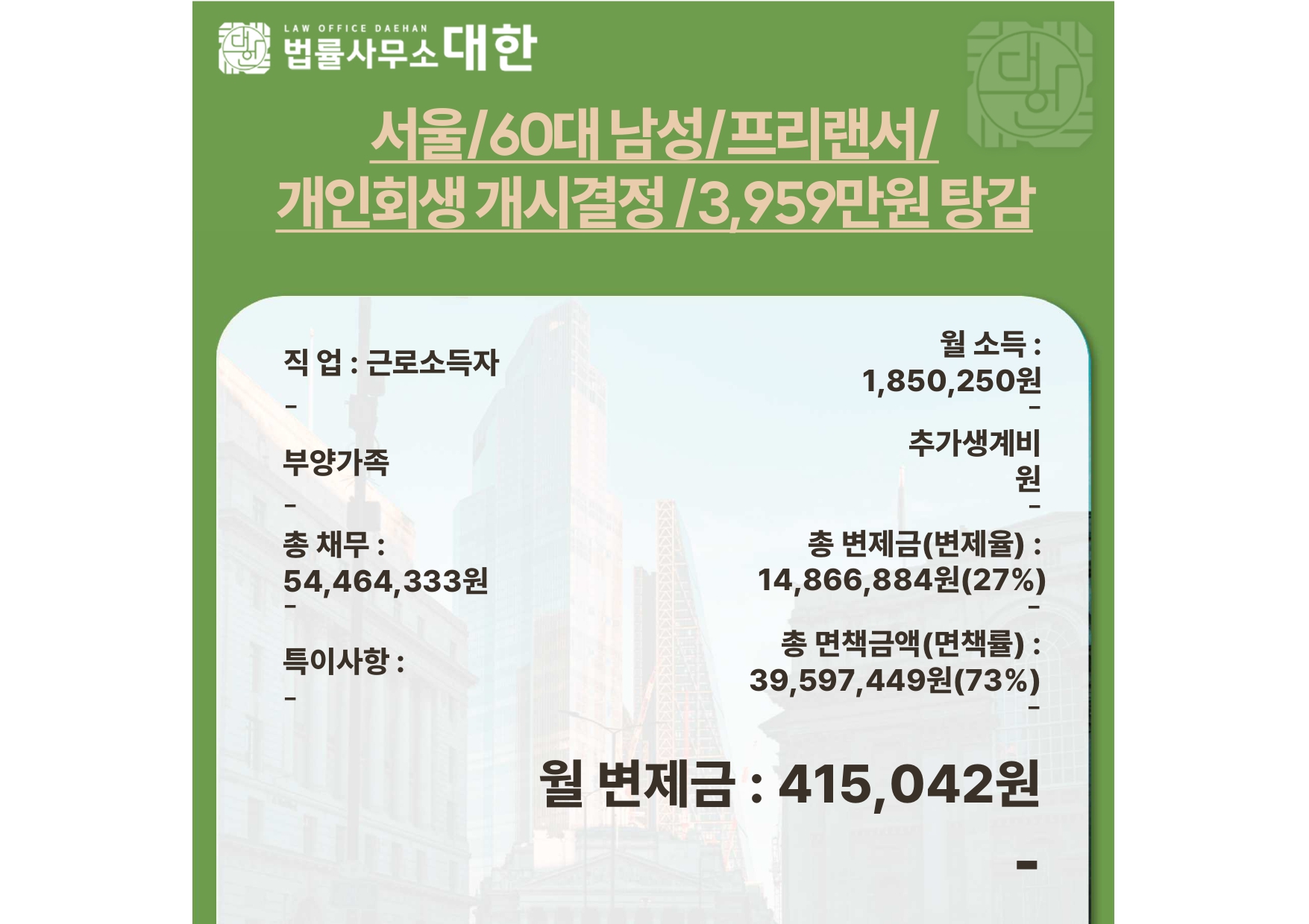 서울/60대 남성/프리랜서/개인회생 개시결정/3,959만원 탕감