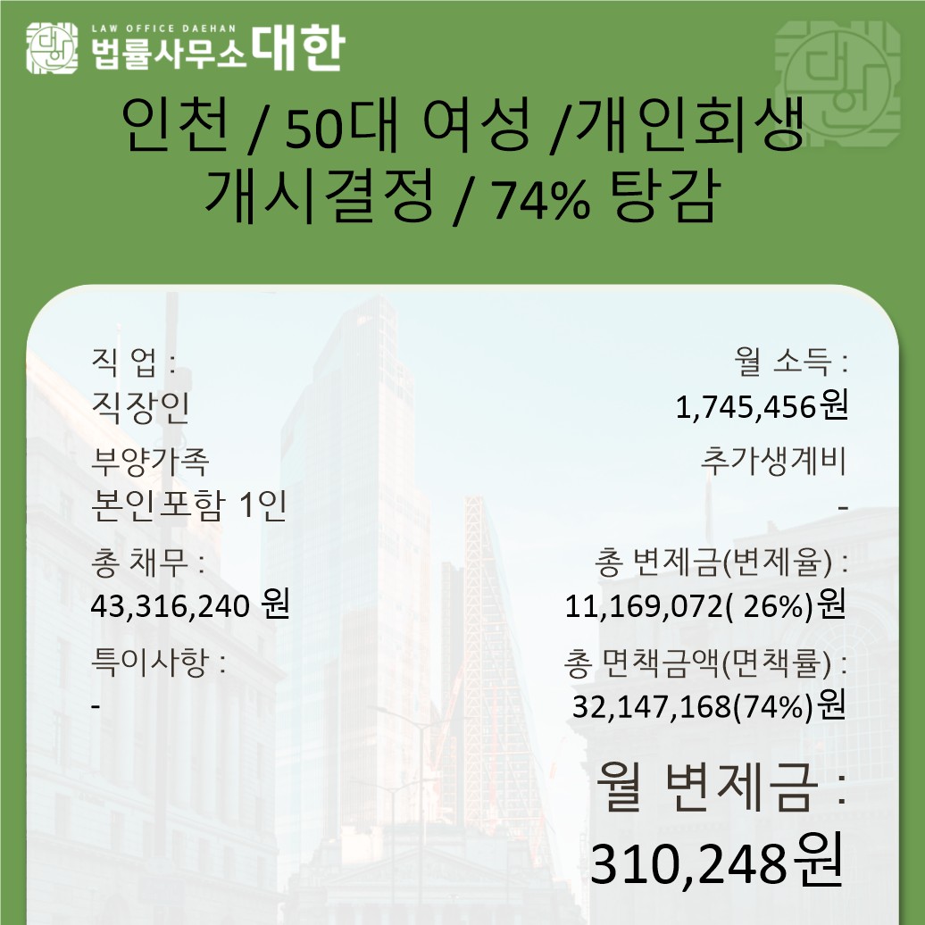 인천 / 50대 여성 /개인회생 개시결정 / 74% 탕감