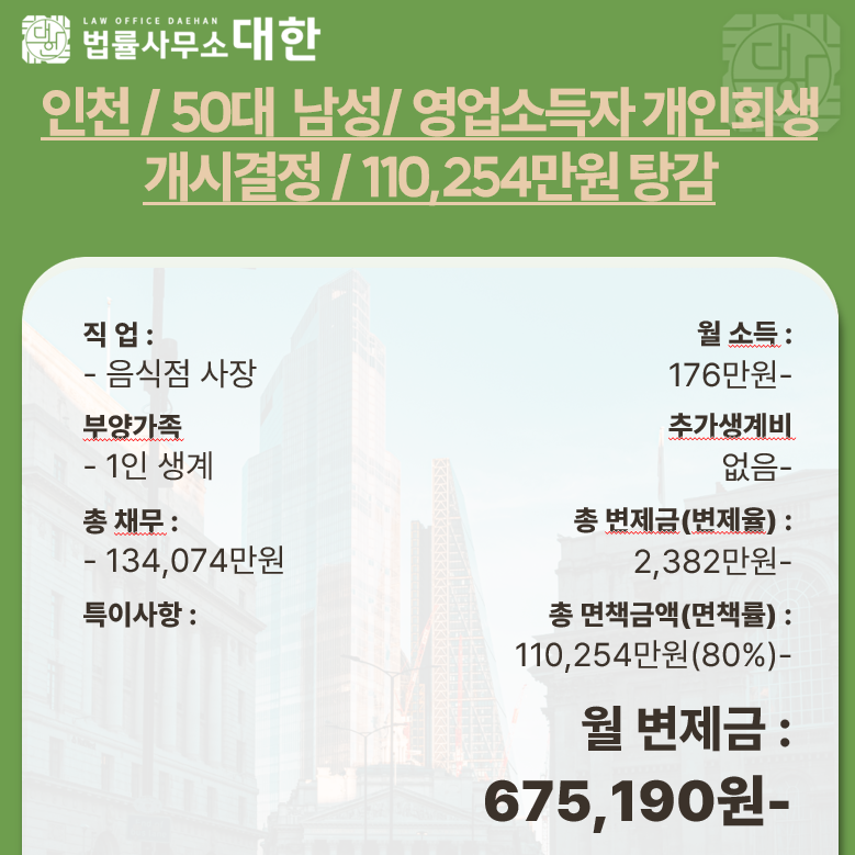 인천/ 50대 남성/ 영업소득자 개인회생 개시결정 / 1억200만원 탕감