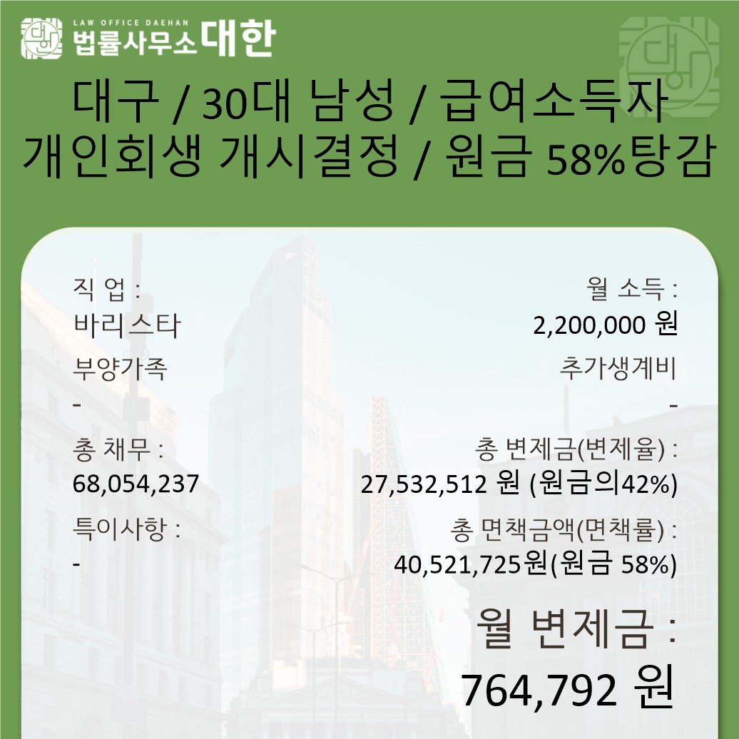 대구 / 30대 남성 / 급여소득자 / 개인회생 개시결정 / 원금 58%탕감