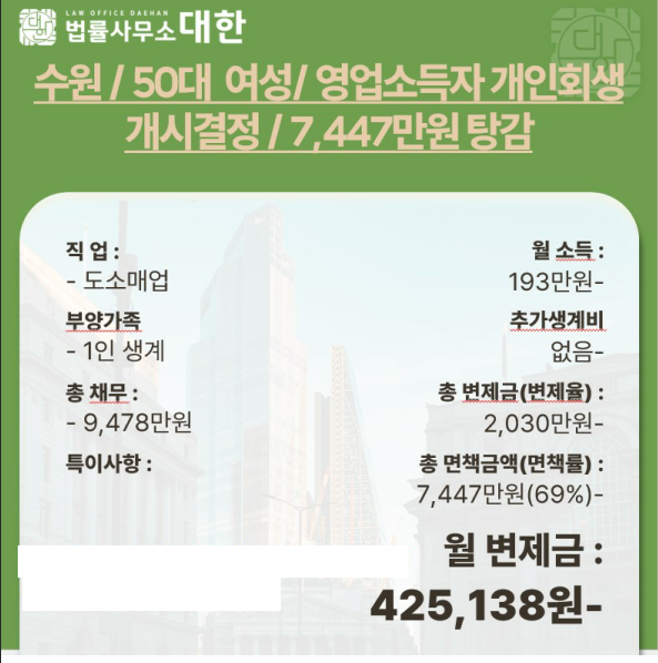 수원/ 50대여성/ 영업소득자 개인회생 개시결정/ 7,447만원 탕감