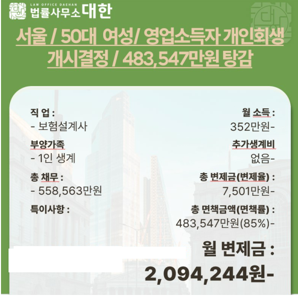 서울/ 50대여성/ 보험설계사 개인회생 개시결정/ 4억8천만원 탕감
