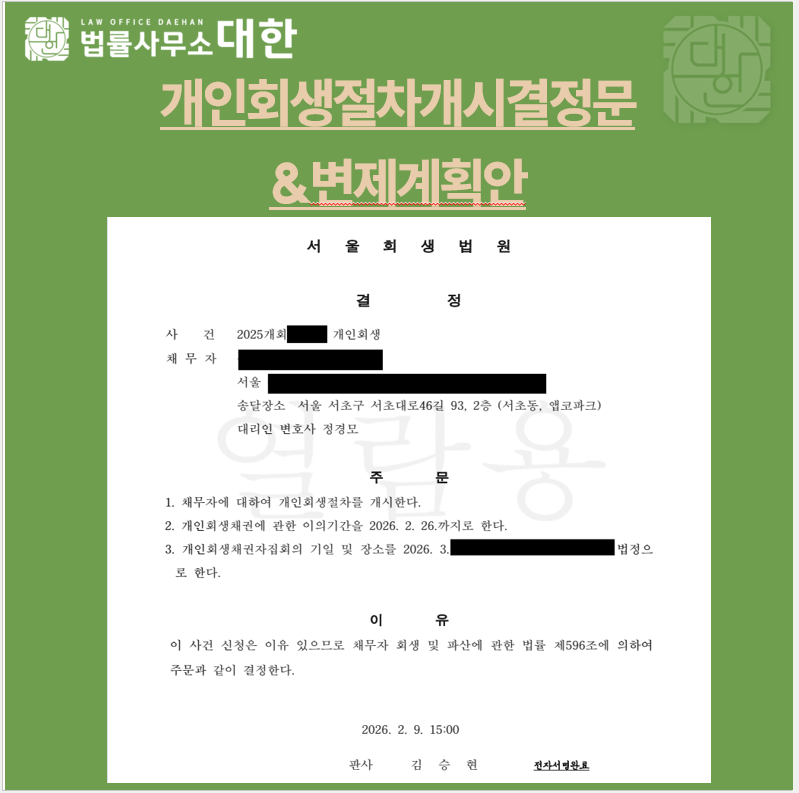 서울/ 40대남성/ 영업소득자 개인회생개시결정/ 4억 4천만원 탕감