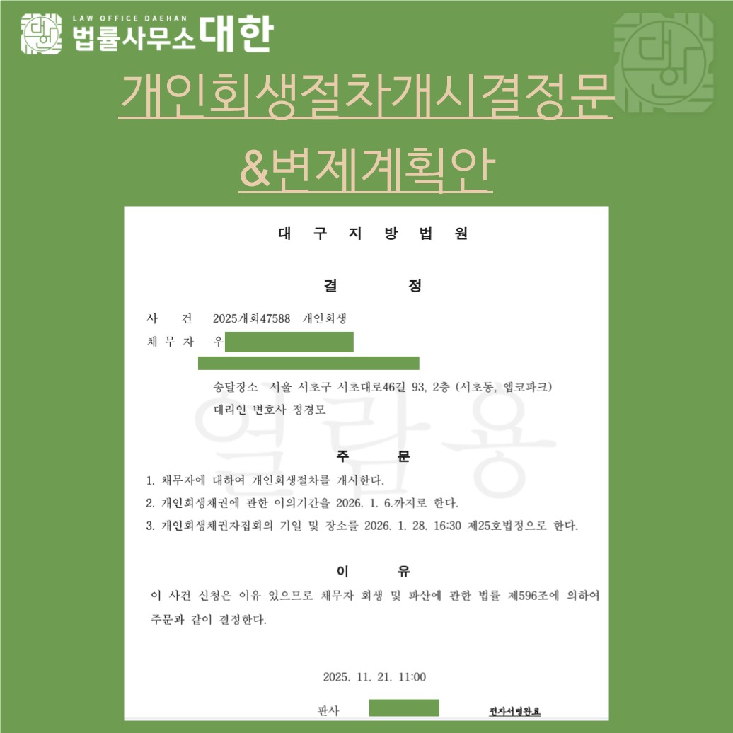 어려운 가정형편으로 사회초년생부터 발생한 채무가 돌려막기등으로 감당할수 없는 지경에 이르러 개인회생을 신청하게되었고, 이자전액 탕감 및 원금 58% 탕감의 개시결정을 받게 되었습니다.