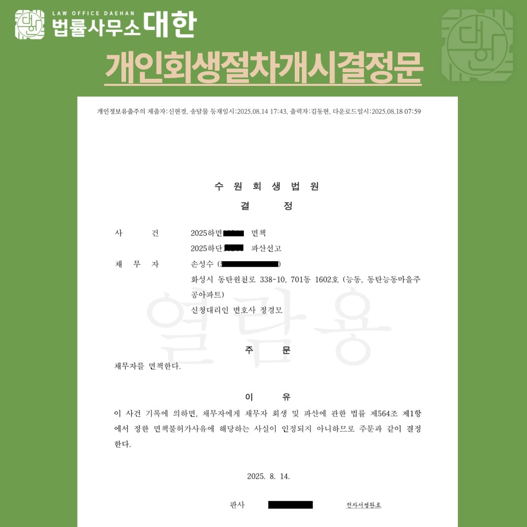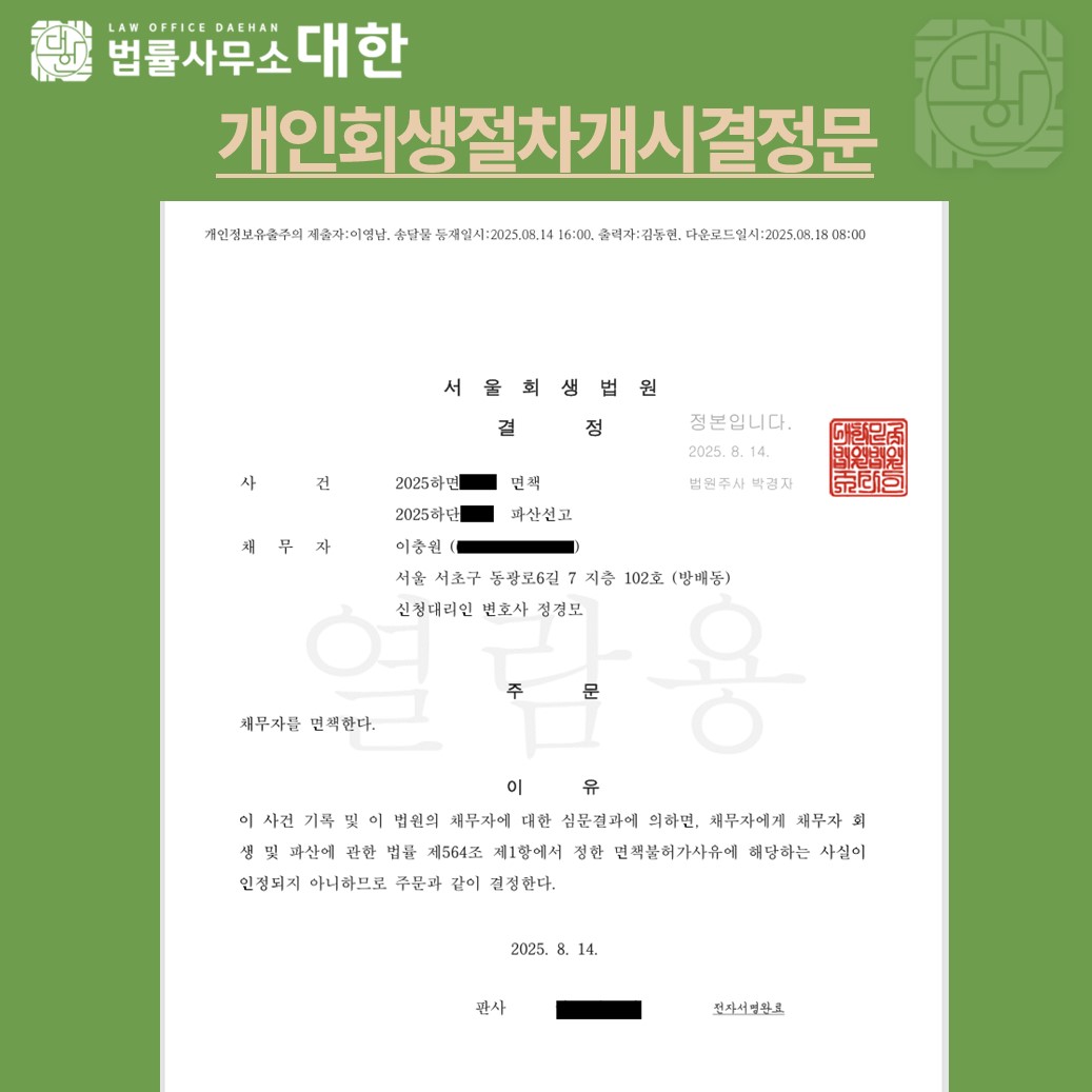서울 / 50대 남성 / 무직자 파산 면책결정 / 2억 탕감