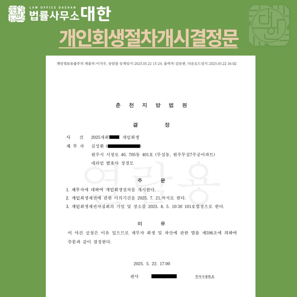 춘천 / 60대 남성 / 급여소득자 개인회생 개시결정 / 2200만원 탕감