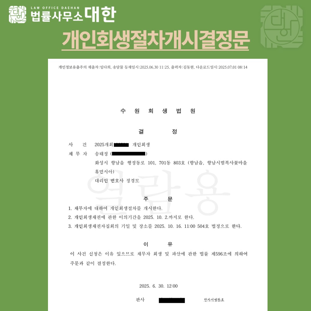 수원 / 30대 남성 / 급여소득자 개인회생 개시결정 / 9857만원 탕감