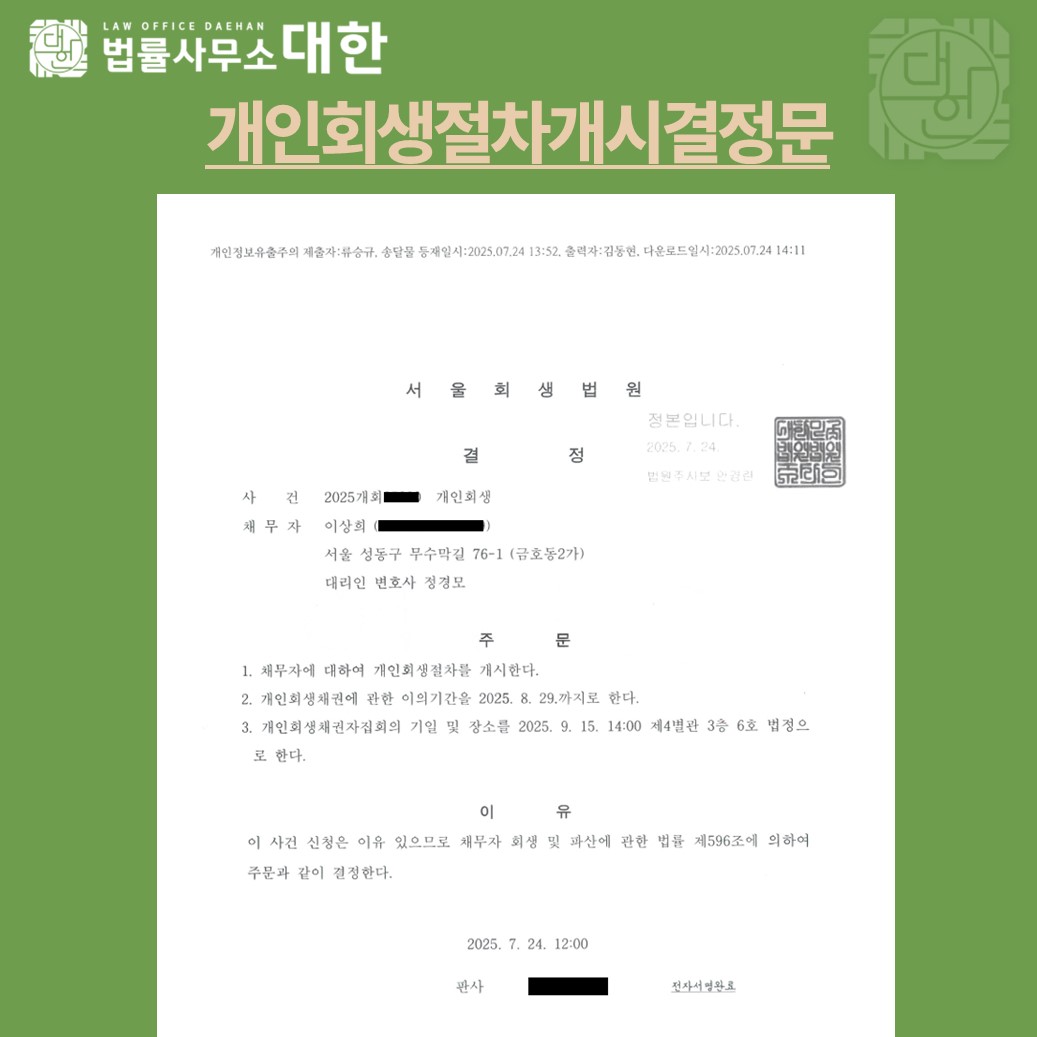 서울 / 50대 여성 / 급여소득자 개인회생 개시결정 / 3339만원 탕감