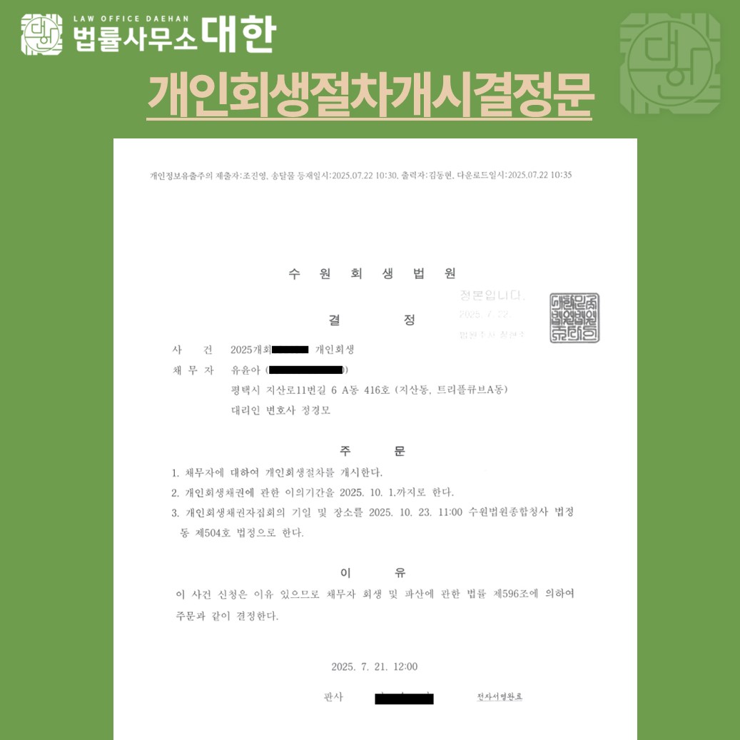 수원 / 30대 여성 / 급여소득자 개인회생 개시결정 / 6984만원 탕감