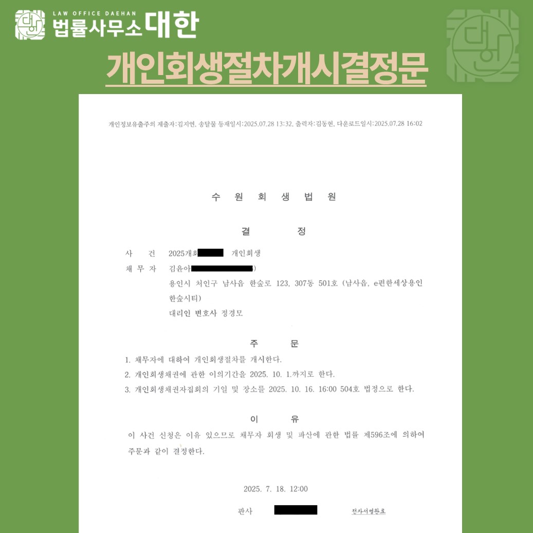 수원 / 30대 여성 / 급여소득자 개인회생 개시결정 / 1억 1500만 탕감