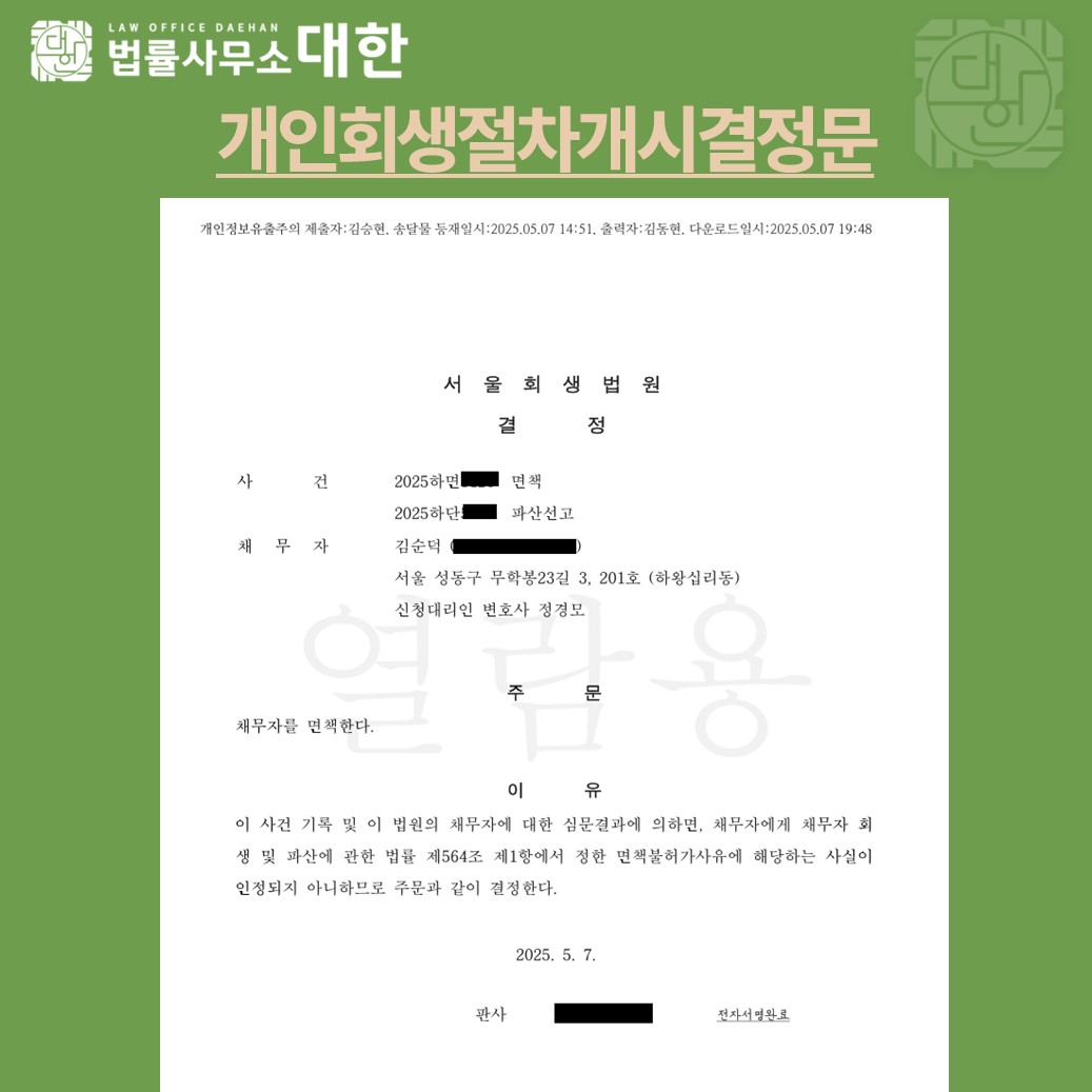 위 사건은 배우자 모르게 진행하는 사건으로 당시 배우자의 자산(부동산)이 있었는데 담보대출 관련 자료를 제출하지 못하여 많이 힘들었던 사건. 자료 대출받은 은행측으로 문서제출명령신청 하여 받아서 겨우 개시결정 받음. 또한 최저임금에도 미치지 못하는 150만원의 수입이지만 위부분 최대한 다투어 인정 받음. 조건부도 나오지 않아서 좋은 결정 받은 사건