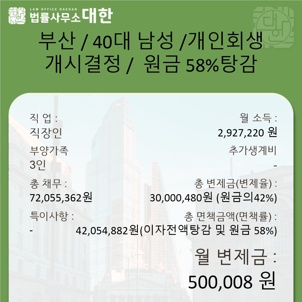 부산/40대 남성/개인회생 개시결정/원금 63%탕감