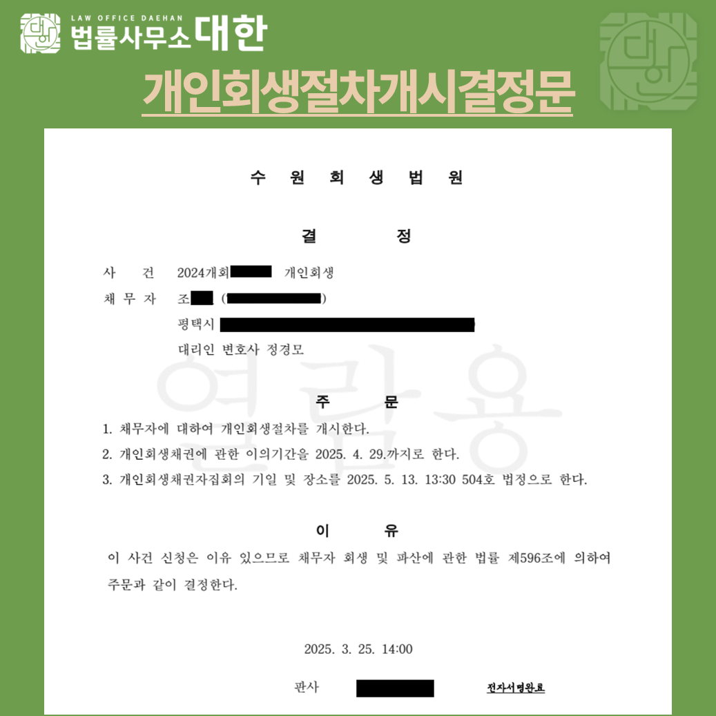 사업 운영의 어려움과 보이스피싱 피해로 인해 개인회생을 신청하게 되었습니다. 채무자의 재산을 성실히 반영하여 1차 보정권고 없이 바로 개시 결정을 받았습니다.