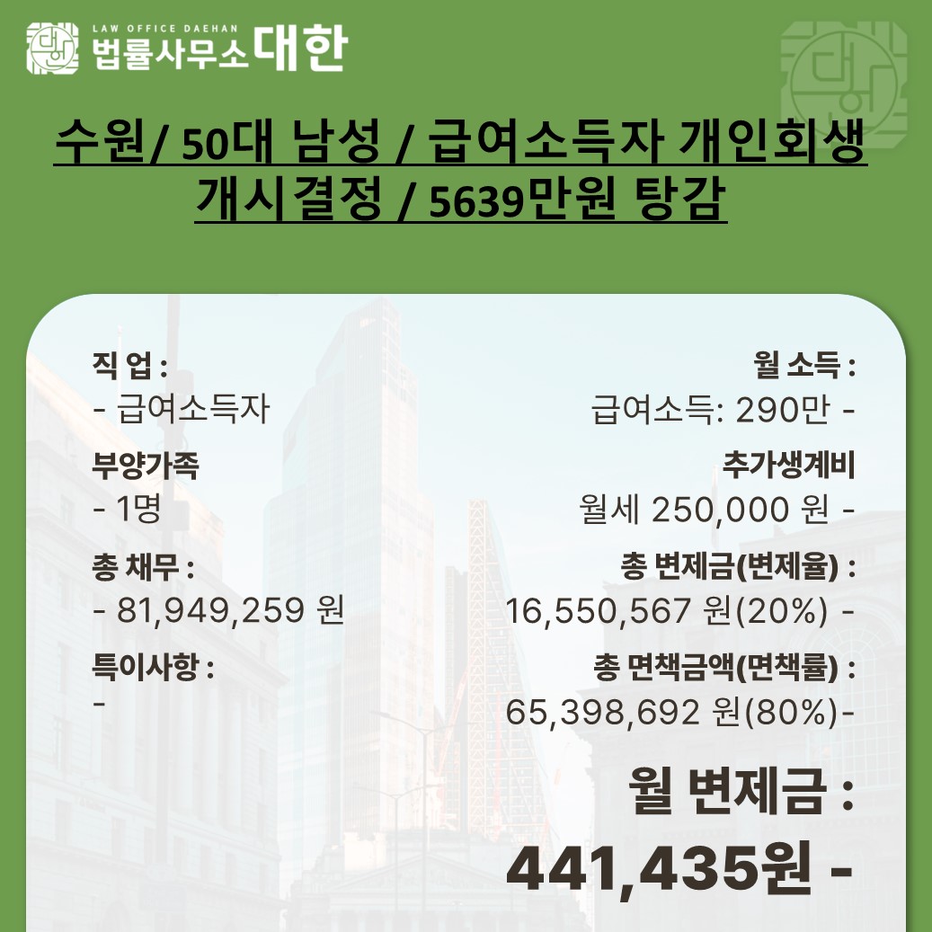 수원 / 50대 남성 / 급여소득자 개인회생 개시결정 / 5639만원 탕감