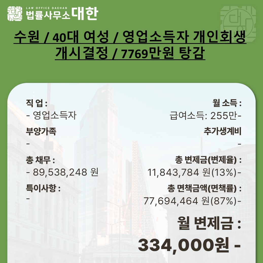 수원 / 40대 여성 / 영업소득자 개인회생 개시결정 / 7769만원 탕감