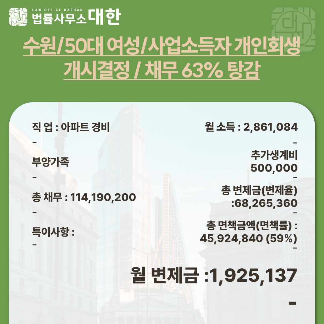 수원 / 50대 여성 / 영업소득자 / 개인회생 개시결정 / 45,924,840원 탕감