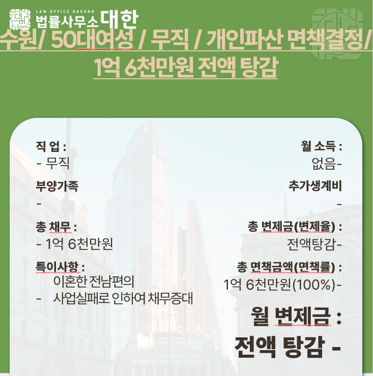 수원/ 50대여성 / 무직/ 개인파산 면책결정/ 1억 6천만원 전액탕감