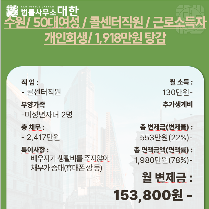 수원 / 50대여성/ 콜센터직원/ 근로소득자 개인회생 / 1,918만원 탕감