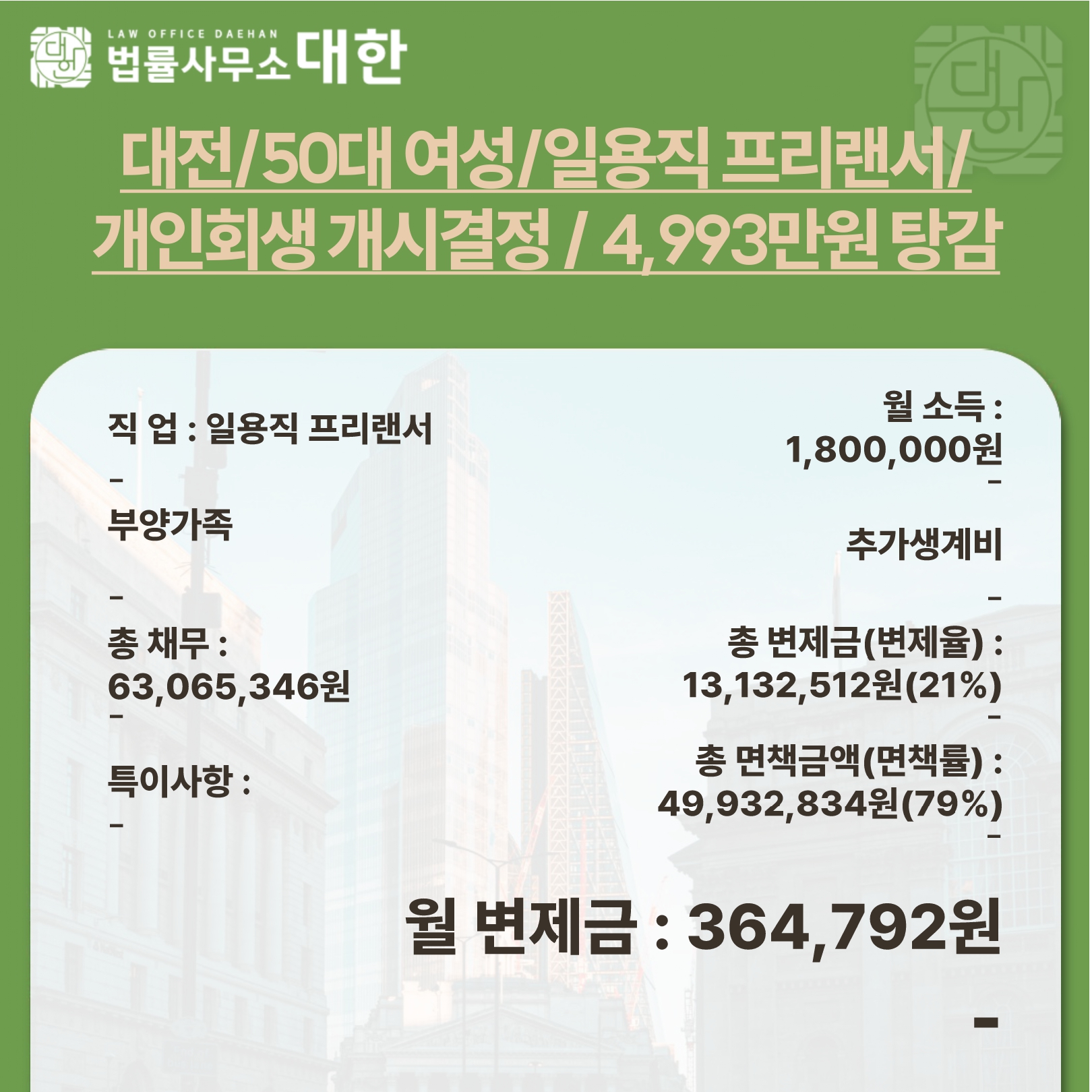 대전 / 50대 여성 / 일용직 프리랜서 / 개인회생 개시결정 / 4,993만원 탕감
