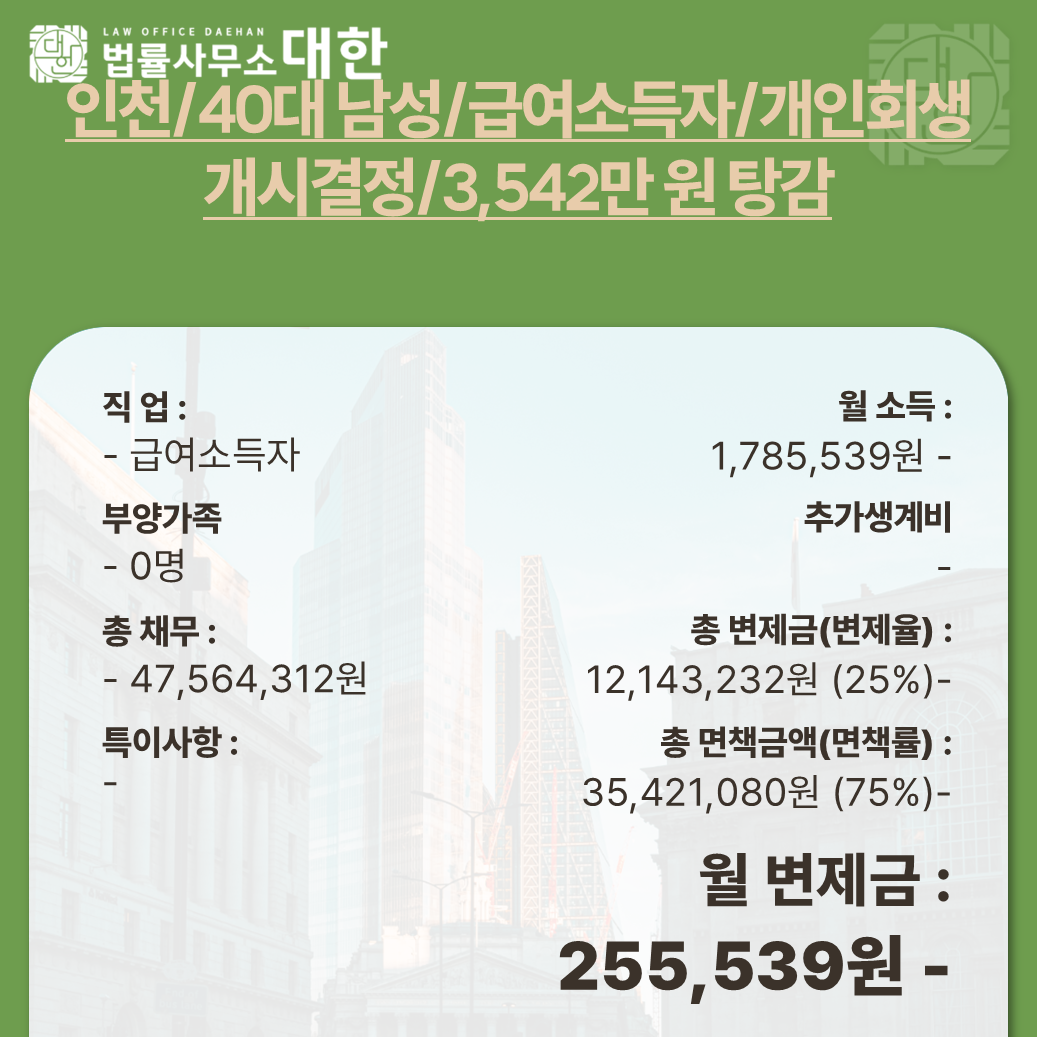 인천 / 40대 남성 / 급여소득자 / 개인회생 개시결정 / 3,542만 원 탕감