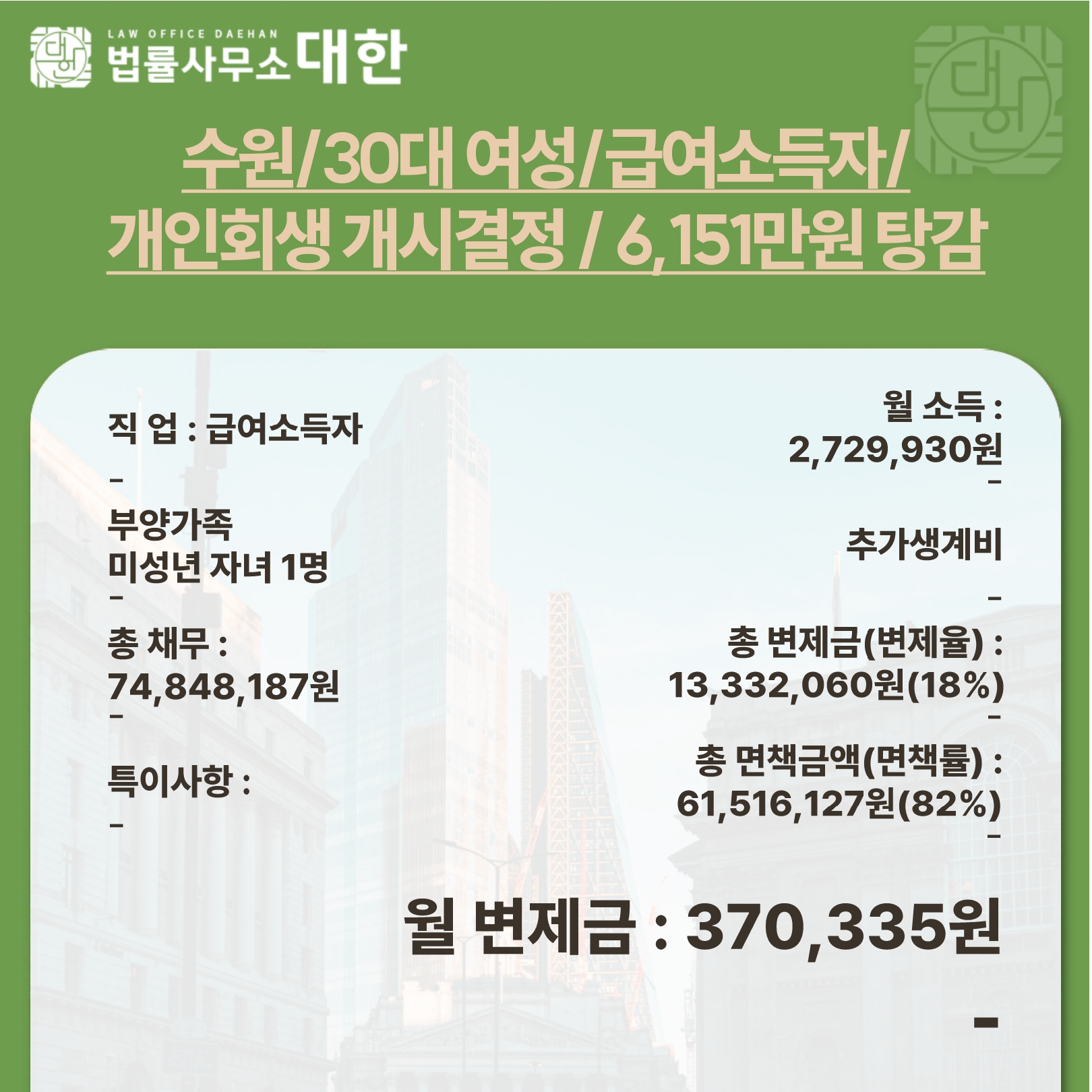 수원 / 30대 여성 / 급여소득자 / 개인회생 개시결정 / 6,151만원 탕감