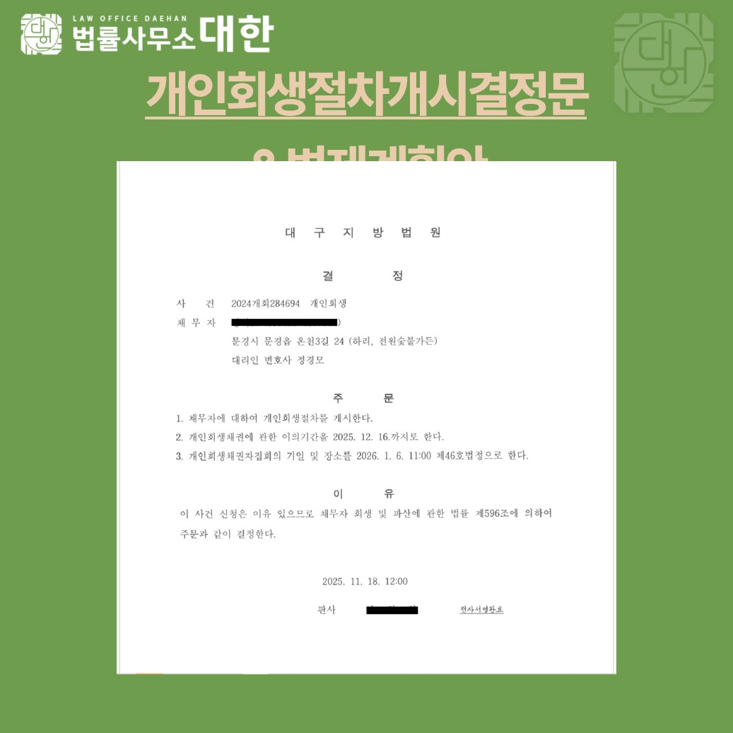 대구 / 30대 남성 / 급여소득자 개인회생 개시결정 / 8564만원 탕감