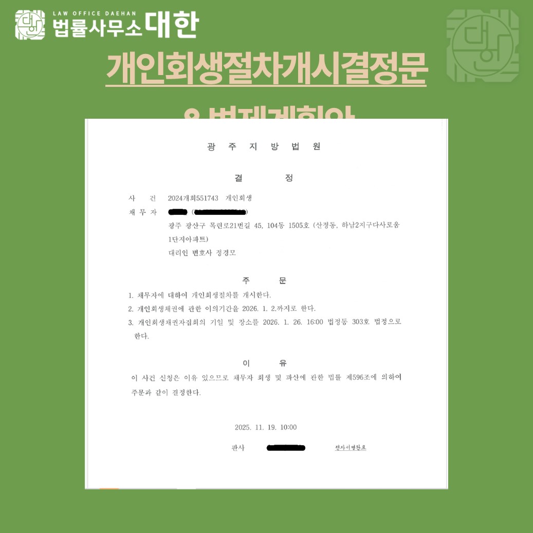 개인회생 3번째 신청임에도 열심히 도와드려 원금 8% 상환으로 결정받음. 부모님 부양가족으로 인정받기 위하여 노하우로 최대한 다투어 인정받음 (부모님 소유 부동산도 있었음) 최근대출도 상당하였으나 고의적으로 발생시킴이 아닌 필요하여 사용한 부분 최대한 소명하여 재산반영 없이 결정