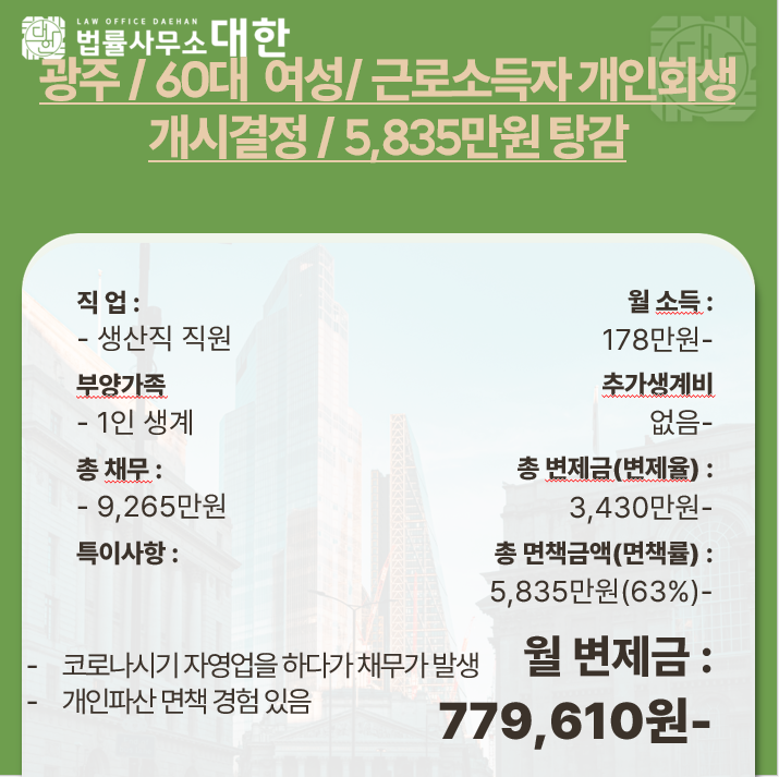 광주/60대 여성/근로소득자 개인회생 개시결정/ 5,835만원 탕감