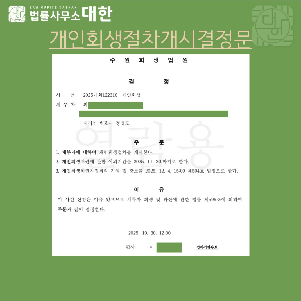 사업 실패 및 보이스 피싱 피해로 채무증대로 개인회생을 신청하였으며, 매달 수령하는 연금으로 원금의 18%를 변제하는 개시결정 받았습니다.
