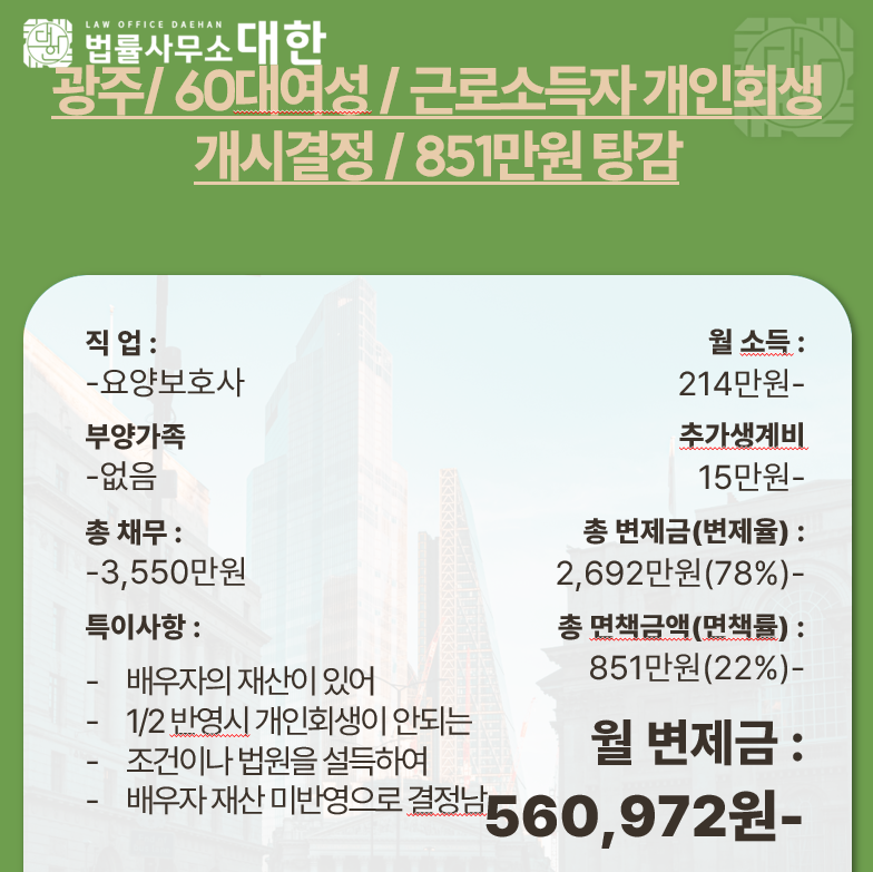 광주/ 60대여성/ 근로소득자 개인회생 개시결정/ 851만원 탕감