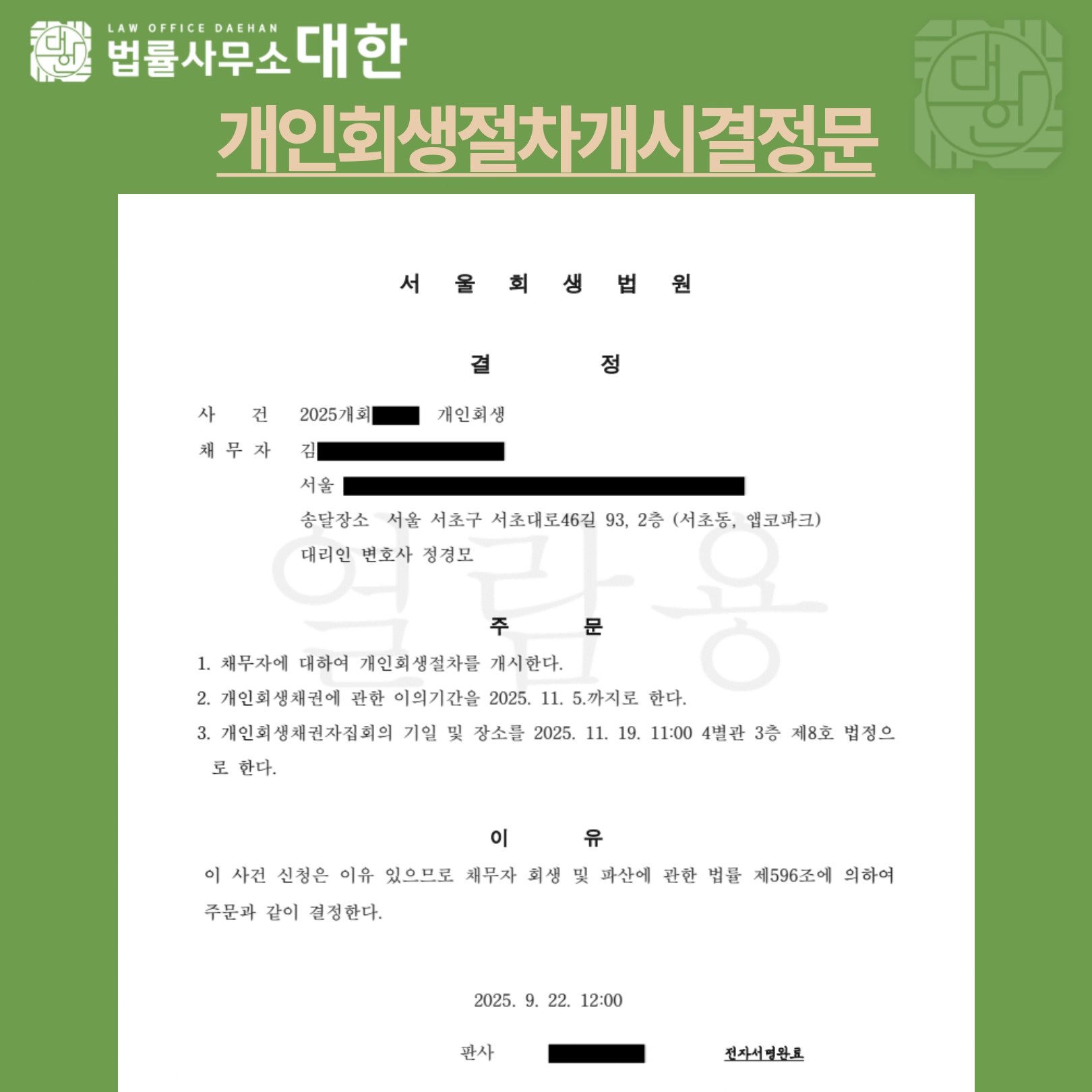 서울/60대 남성/법인대표/개인회생개시결정/2억 1천만 원 탕감