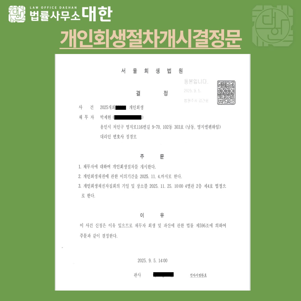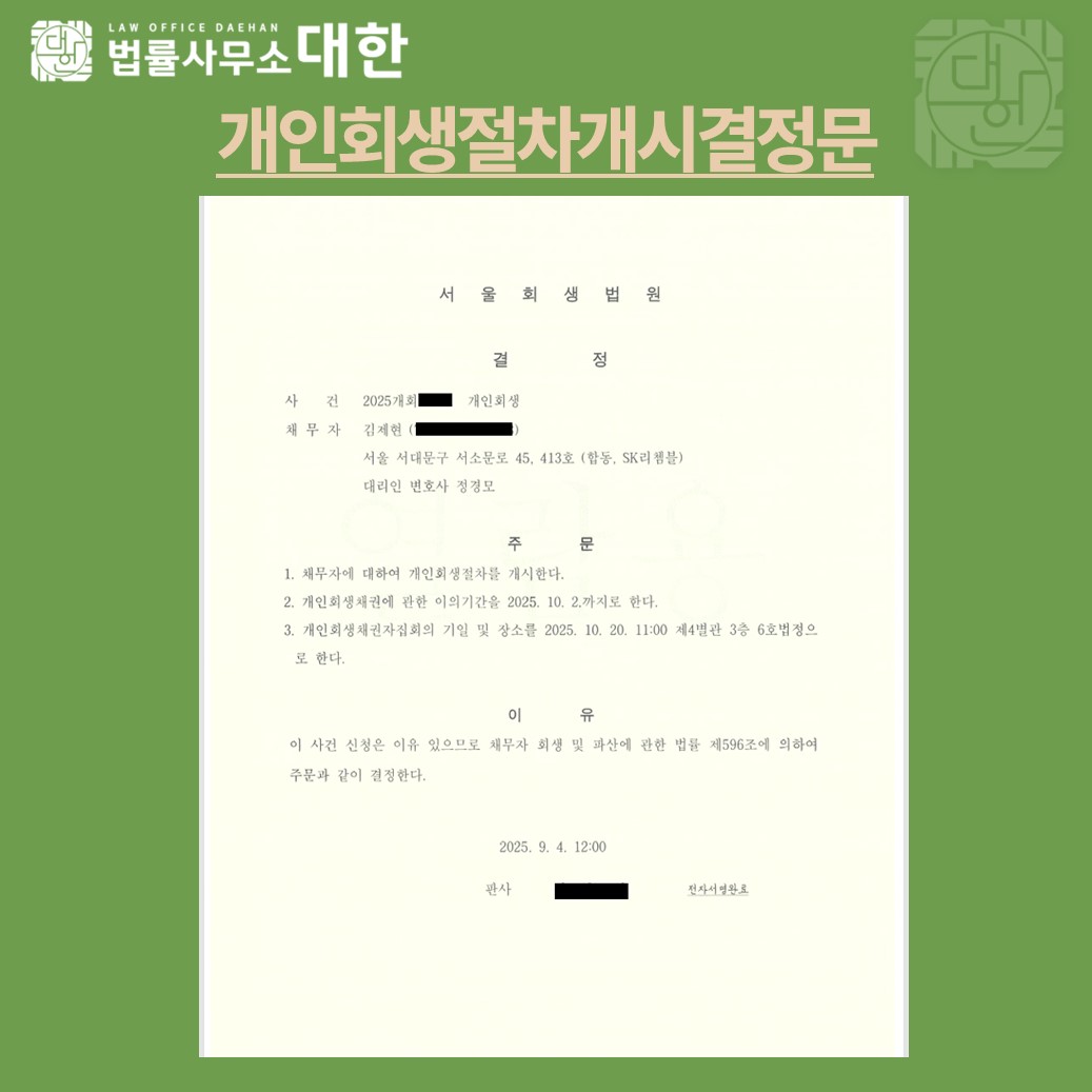 서울 50대 남성 / 급여소득자 개인회생 개시결정 / 3억 820만 탕감