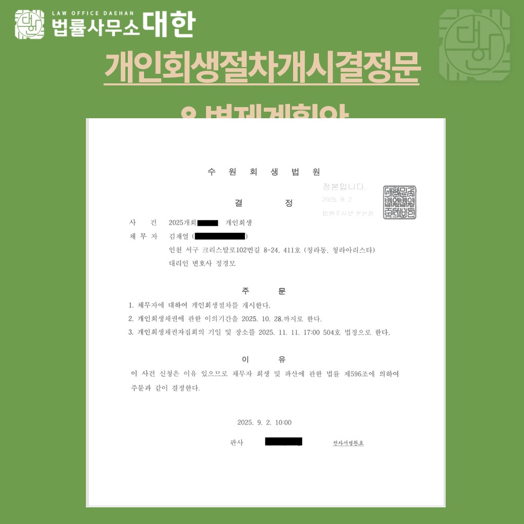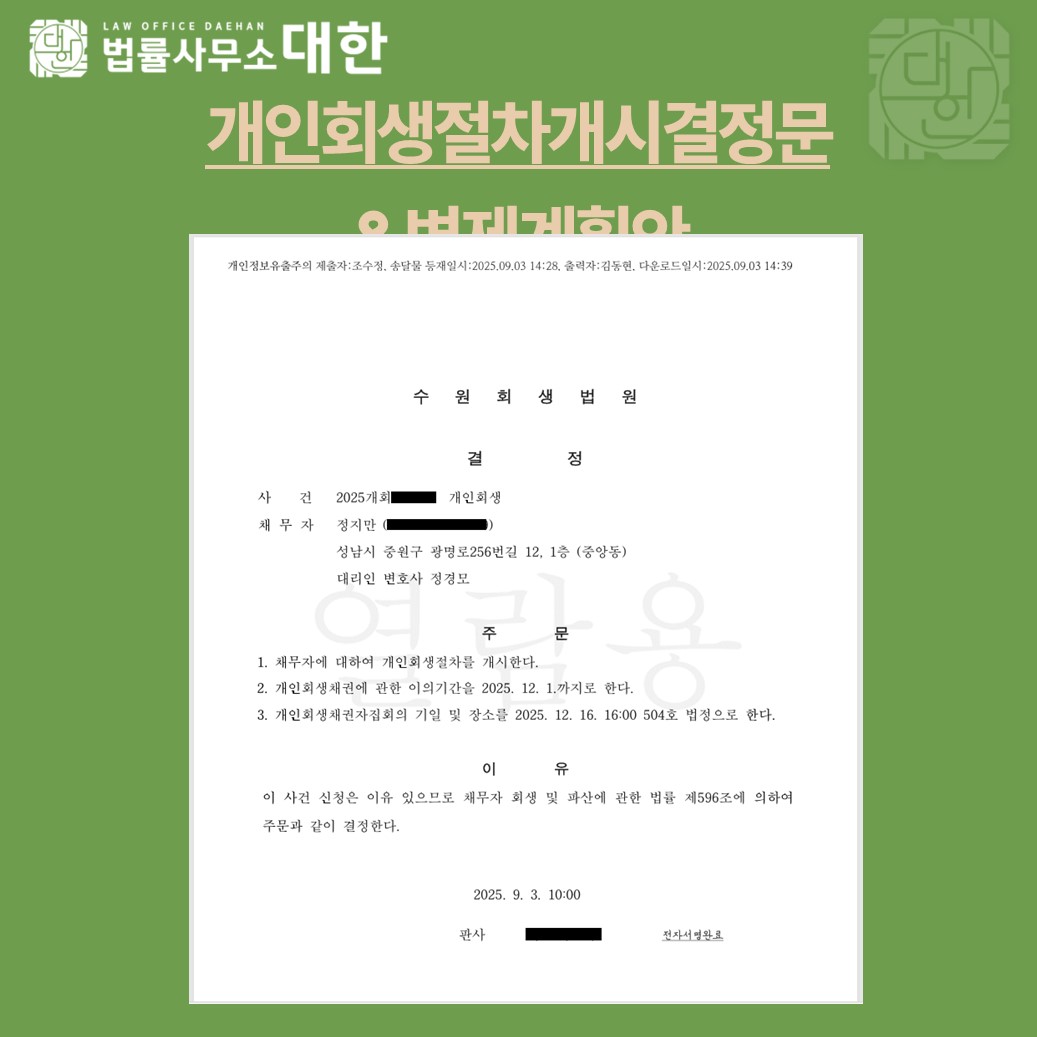 수원 40대 남성 / 급여소득자 개인회생 개시결정 / 2억1678만 탕감