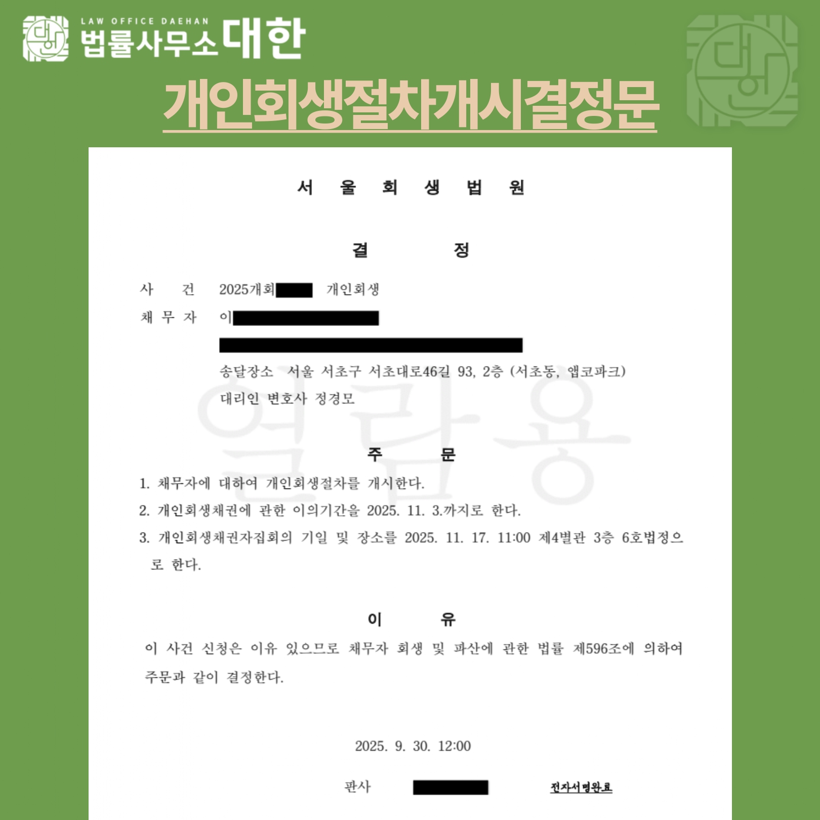 자영업자 특성상 수입이 일정치 않았으나 매입 및 매출의 소명을 잘 마치어 변제율 15%로 개인회생 개시결정을 받았습니다.