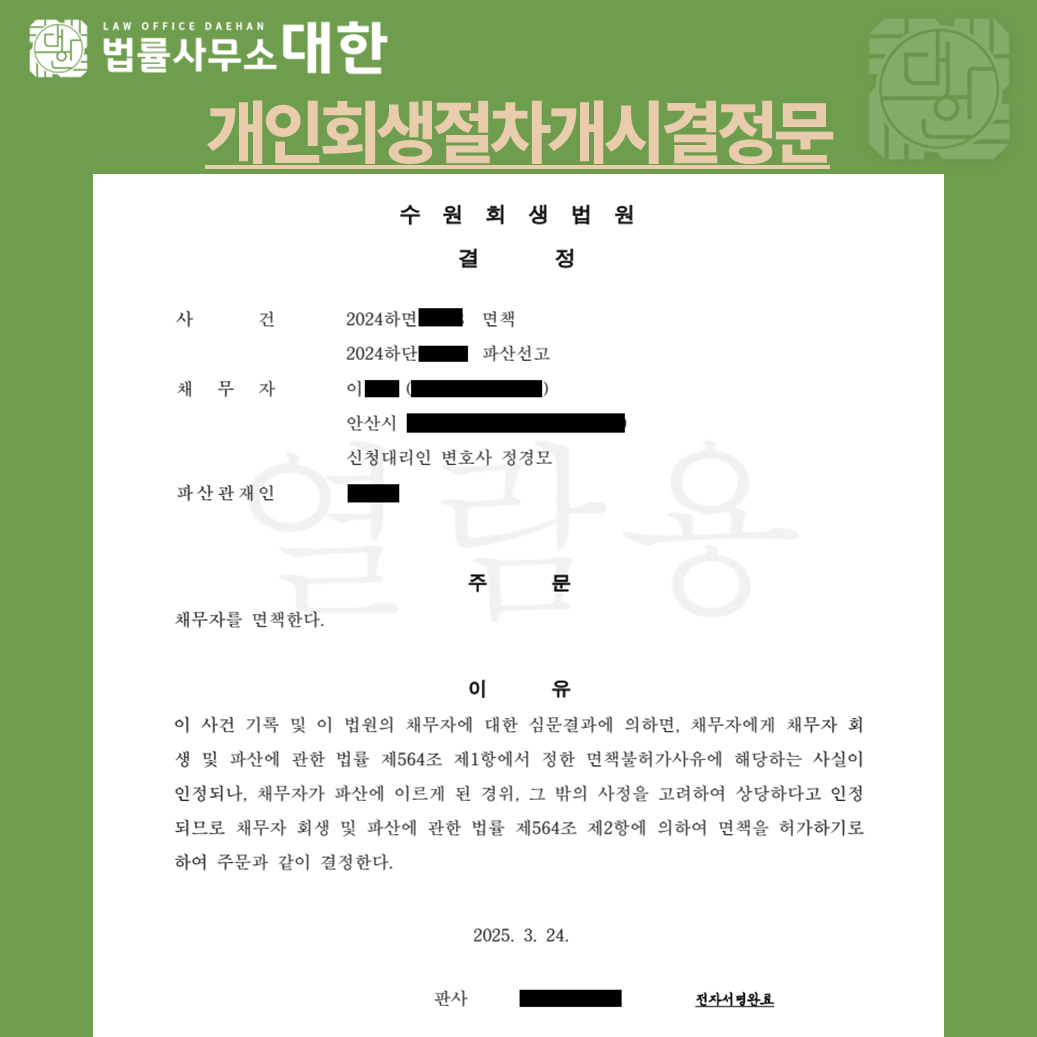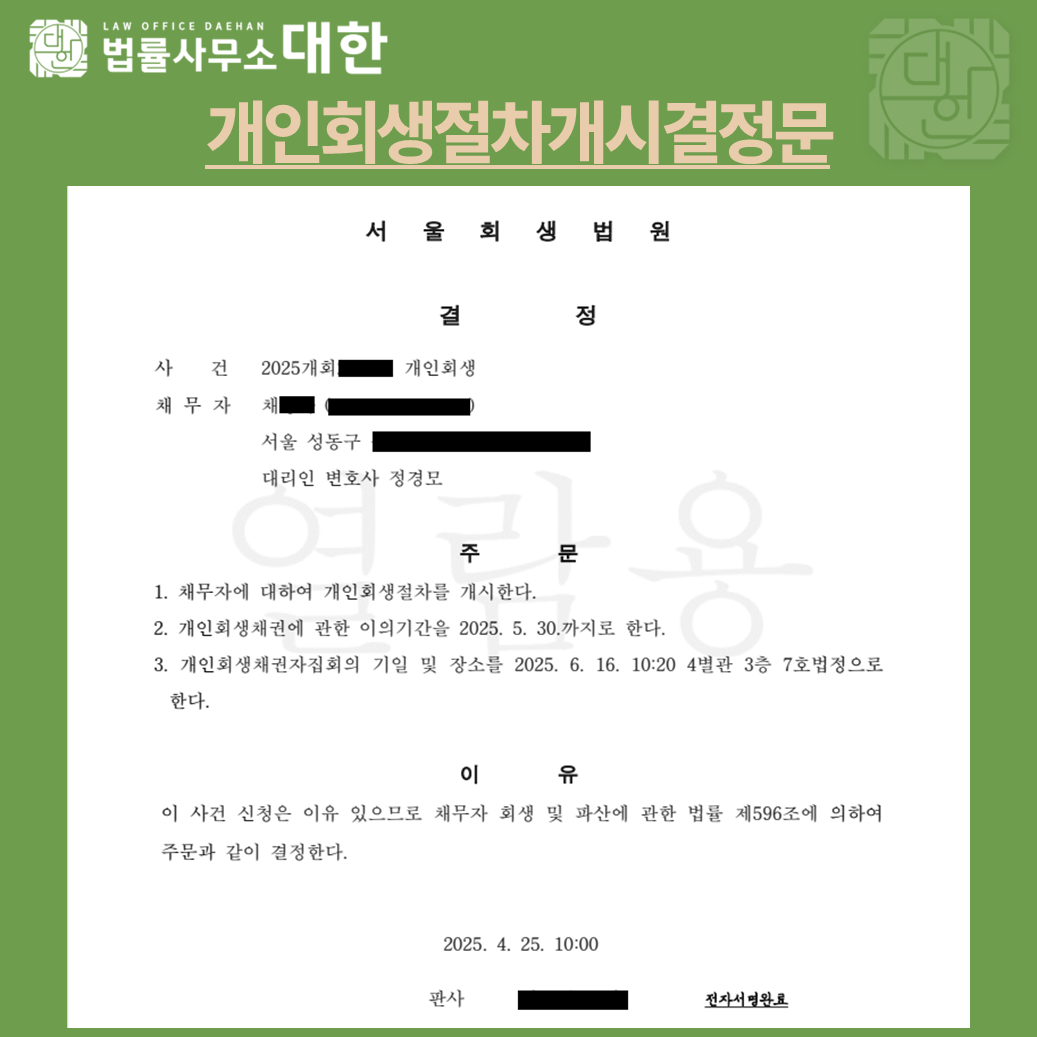 배우자의 건강 악화로 인해 발생한 채무를 변제하기 어려워 개인회생을 신청하게 되었습니다. 채무자의 재산을 성실히 반영하여 1차 보정권고를 이행한 후, 바로 개시 결정을 받았습니다.