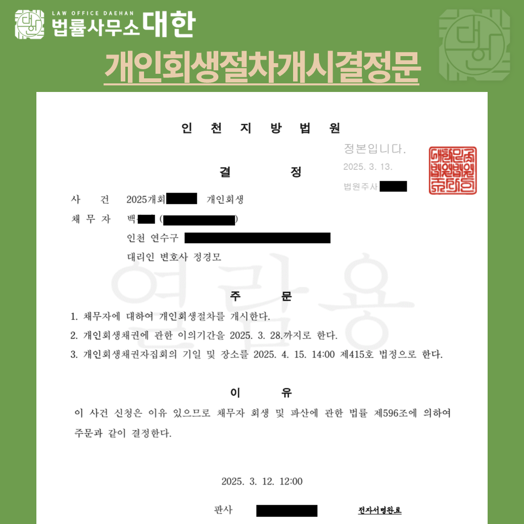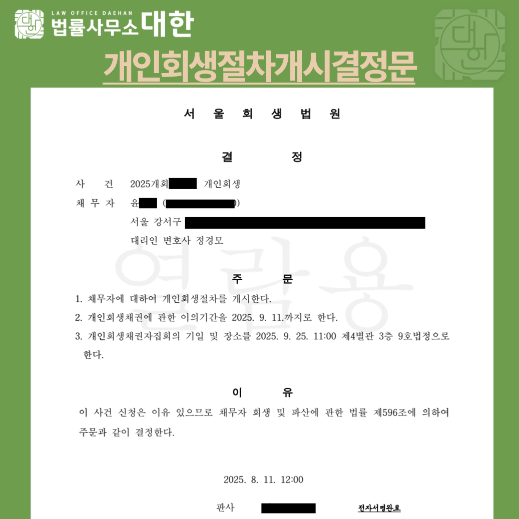 사업 실패로 인해 경제적 어려움을 겪던 채무자는 개인회생을 신청하였습니다. 가상자산(코인) 거래 내역이 있어 우려가 있었으나, 손실액에 대한 소명자료를 제출하고 1차 보정권고를 성실히 이행하였습니다. 그 결과, 조건부 인가이긴 하지만 법원으로부터 개인회생 개시결정을 받았습니다.