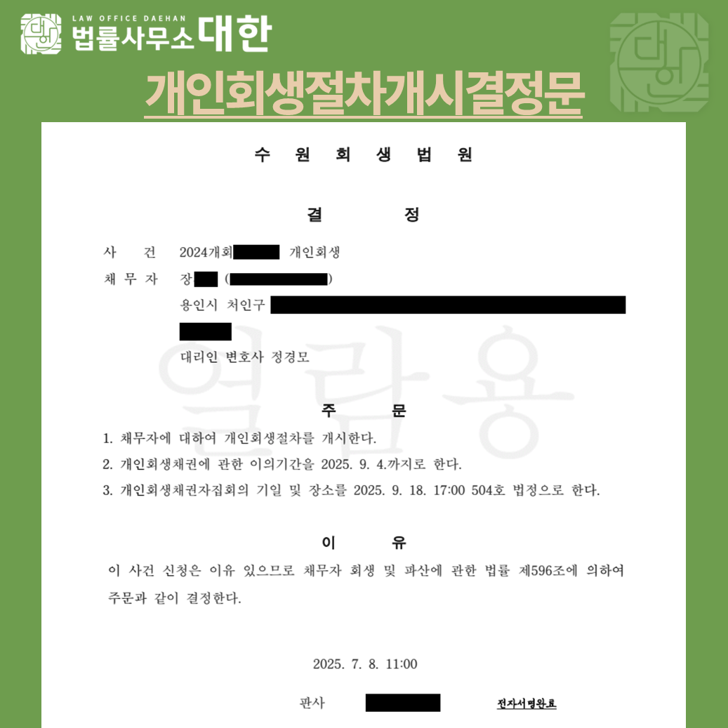 코로나19로 인한 경기 침체로 사업 운영에 어려움을 겪으면서 채무 변제가 불가능해져 개인회생을 신청하게 되었습니다. 채무자는 배우자가 별도의 소득이 없는 가정주부이며, 슬하에 자녀 3명을 둔 4인가구의 생계를 책임지고 있다는 점을 법원에 소명하였습니다. 이에 법원은 생계비를 인정하였고, 1차 보정권고를 성실히 이행한 후 개시결정을 받을 수 있었습니다.