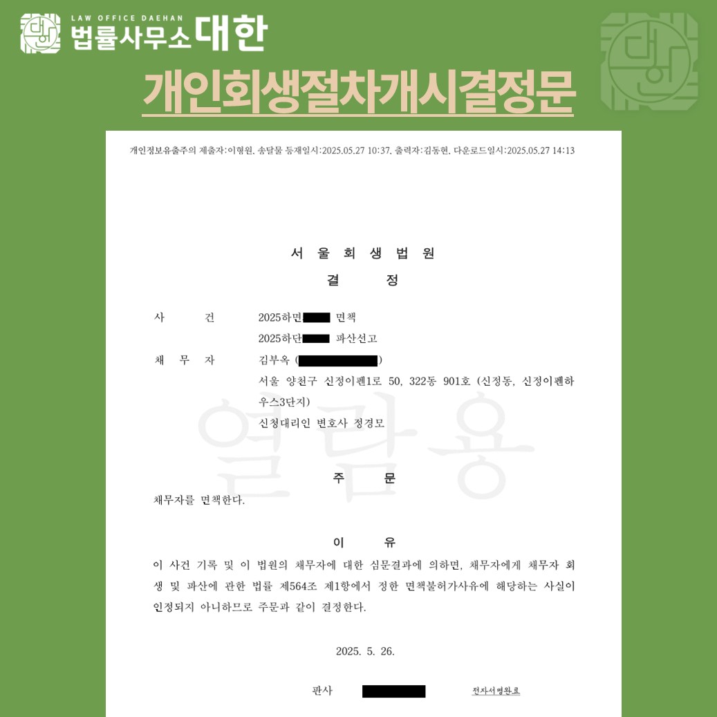 서울 / 60대 여성 / 무직자 파산 면책결정 / 10억 탕감