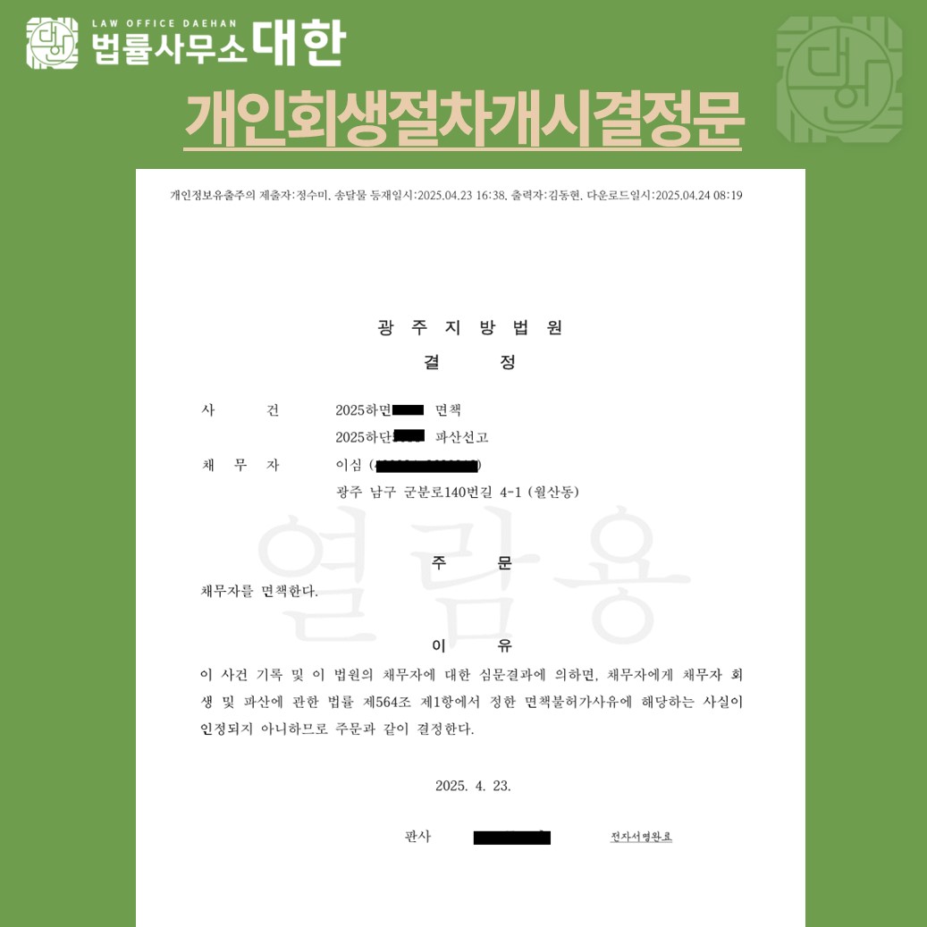 사무실 측에 말하지 않고 접수 시점에 어린이집으로 취업했던 고객. 이후 많이 혼내고 무조건 앞으로는 사소한것도 모두 공유 되어야 한다고 안내드렸으며, 파산 사건을 취하하고 회생을 검토하라고 나올줄 알았으나 인정해줘서 면책결정을 받음. 자녀들이 대기업직원, 교수, 의사로 자녀들에게도 개인적으로 차용을 많이하여 연락이 두절되었는데 자녀들의 서류를 제출하는 부분이 가장 힘들었으나 자녀와 좋게 통화를 하여 직접 준비를 해주어 좋은 결정을 받게 됨.