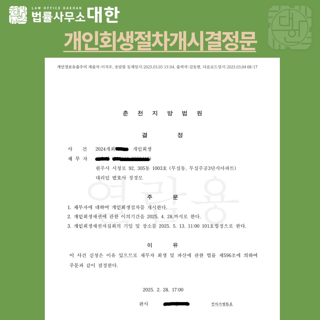 춘천 / 40대 여성 / 급여소득자 개인회생 개시결정 / 4886만원 탕감