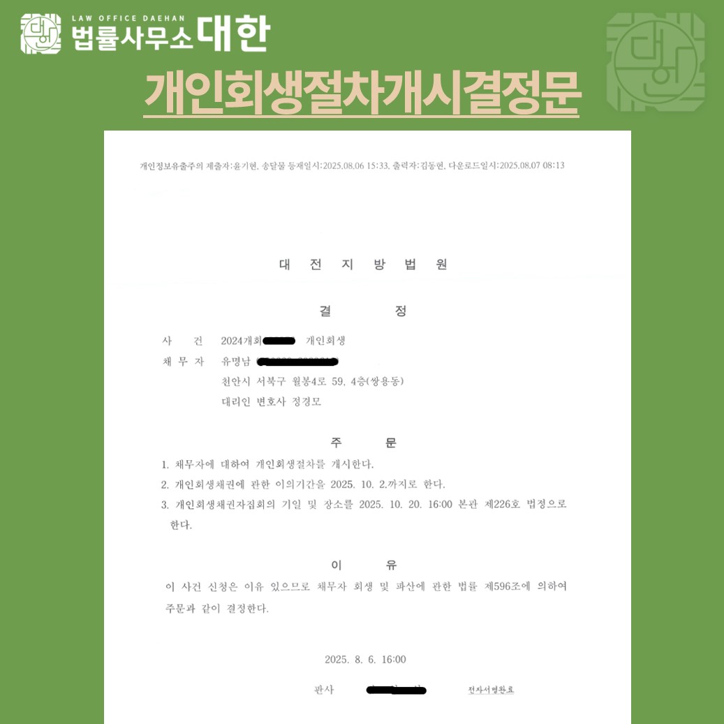 대전 / 60대 여성 / 급여소득자 개인회생 개시결정 / 2억8390만원 탕감