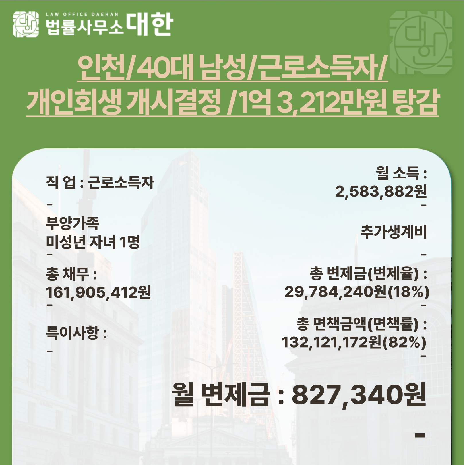인천 / 40대 남성 / 근로소득자 / 개인회생 개시결정 / 1억3,212만원 탕감