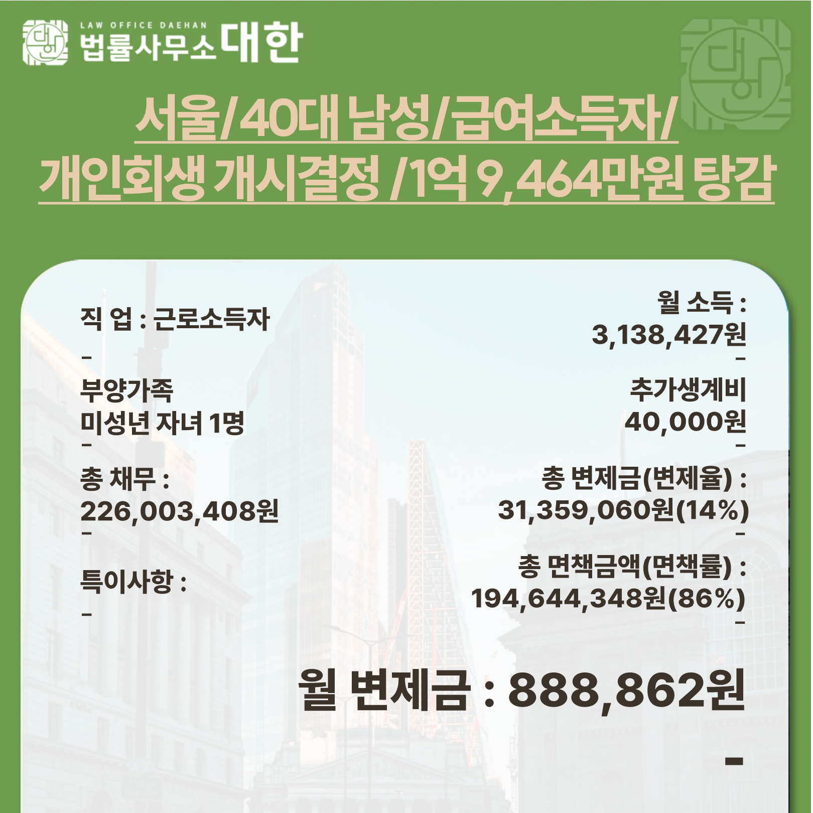 서울/40대 남성/급여소득자/개인회생 개시결정/1억9,464만원 탕감