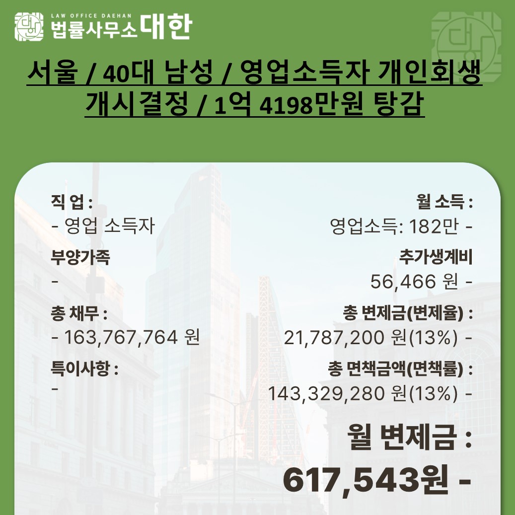 서울 / 40대 남성 / 영업소득자 개인회생 개시결정 / 1억 4198만원 탕감
