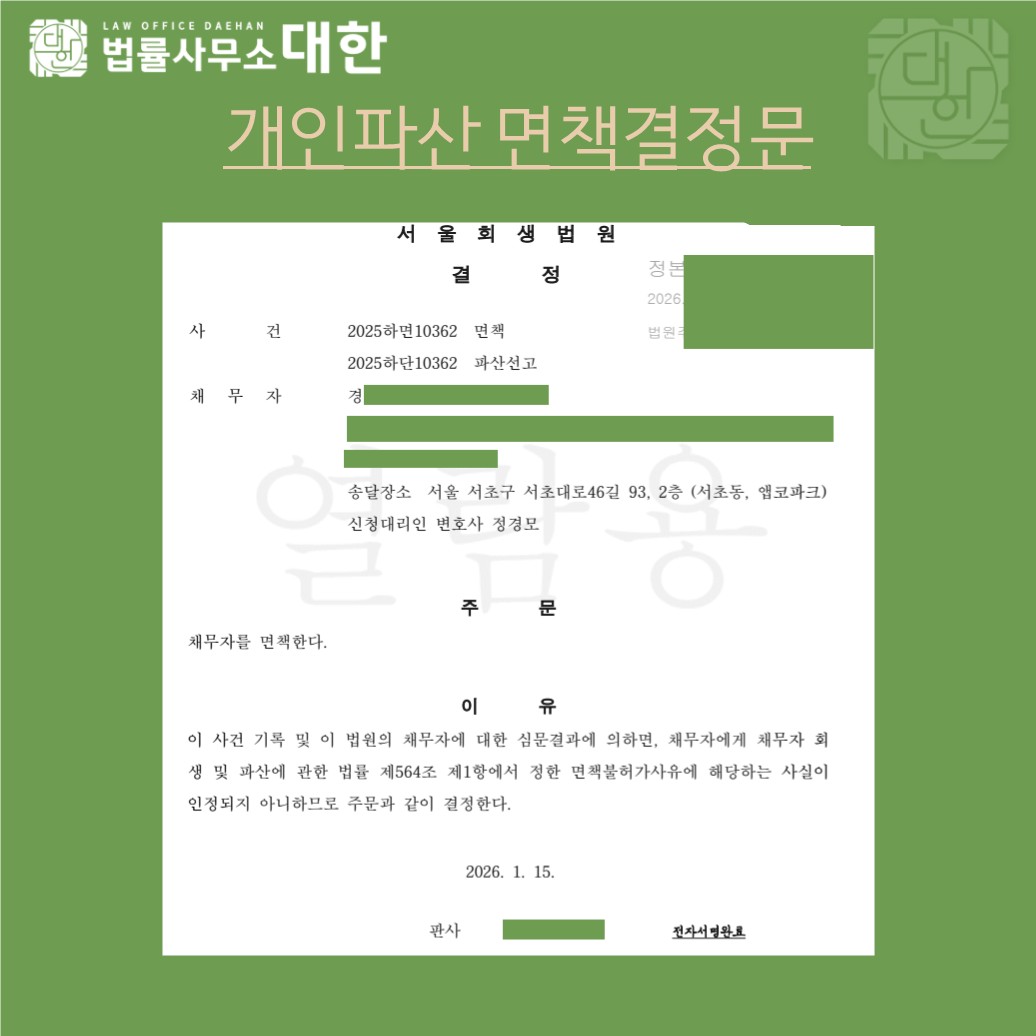 미성년나이부터 시작된 우울증 및 대인기피증으로 인한 정상적인 사회활동 불가로 인한 생활비, 치료비로 인해 발생한 채무를 개인파산 및 면책을 통해 탕감받았습니다.