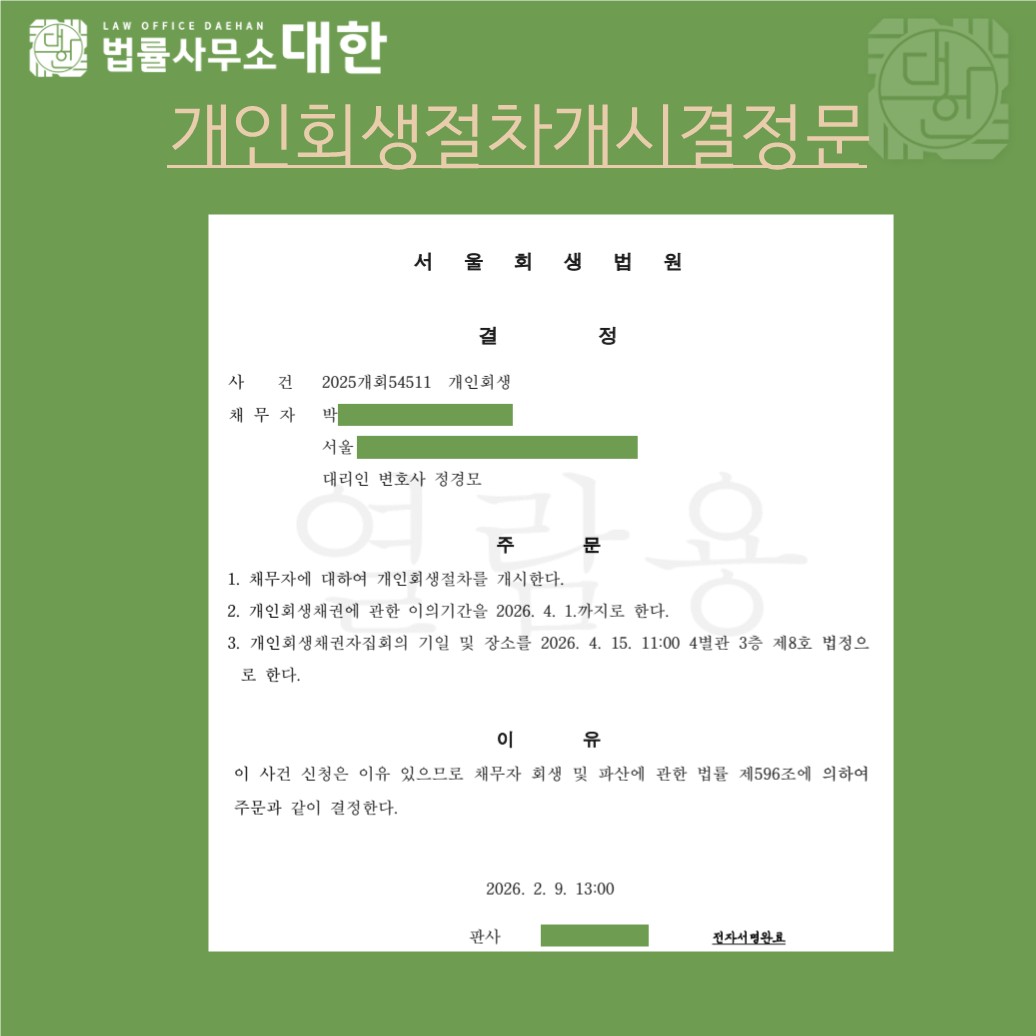 코로나 시기 배우자명의 사업장의 경영난으로인해 채무가 증대되어 개인회생에 이르렀고, 개시결정받았습니다.