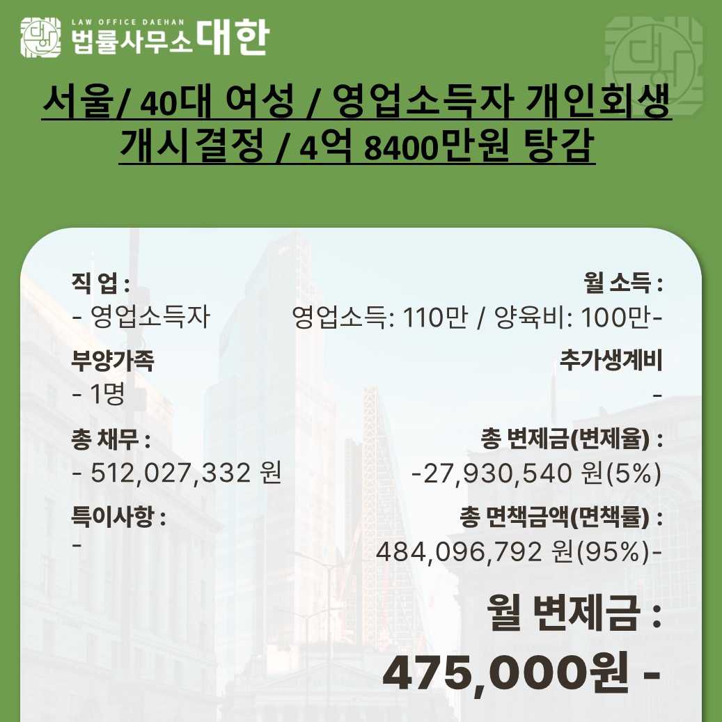 서울/ 40대 여성 / 영업소득자 개인회생 개시결정 / 4억 8400만원 탕감